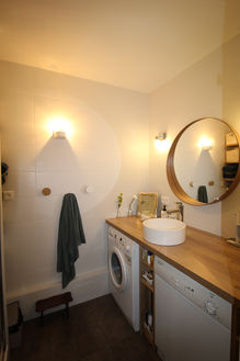 Réagencement complet d'une petite salle de bain, afin qu'elle puisse accueillir élégamment les machines à laver et sécher